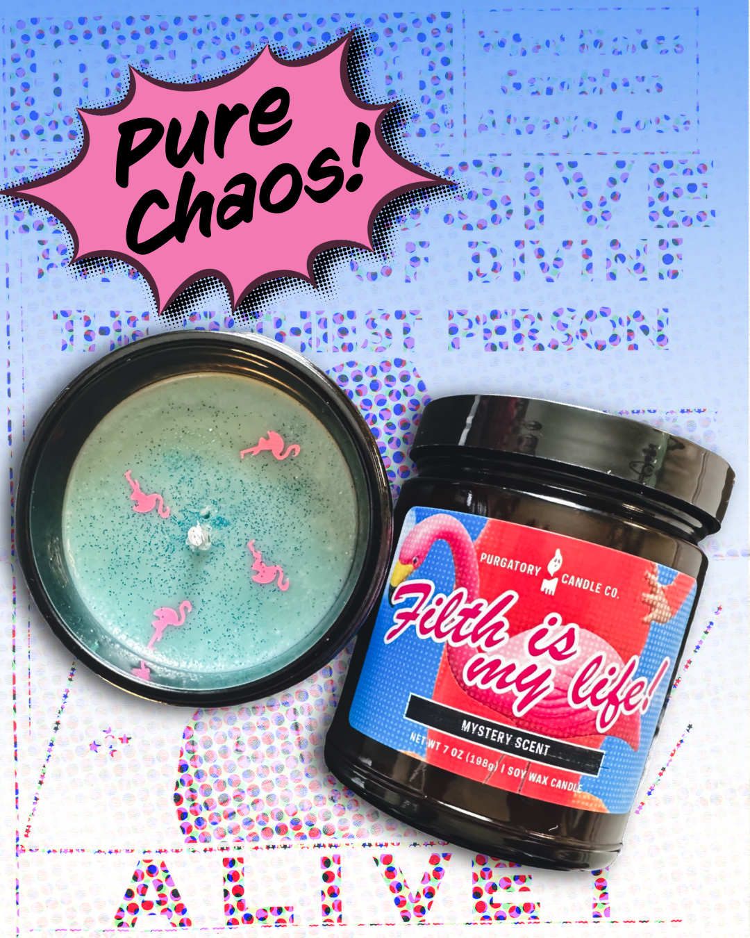 Kill everyone now! Condone first-degree murder! Advocate cannibalism! Eat shit! Filth is my politics! Filth is my life! Inspired by transgressive cinema and unapologetic self-expression, this mystery scent candle celebrates bold individuality. With smoky undertones that linger and intrigue, it's perfect for those who embrace the unconventional and refuse to apologize for their aesthetic. A tribute to fearless artistry and the pope of trash.